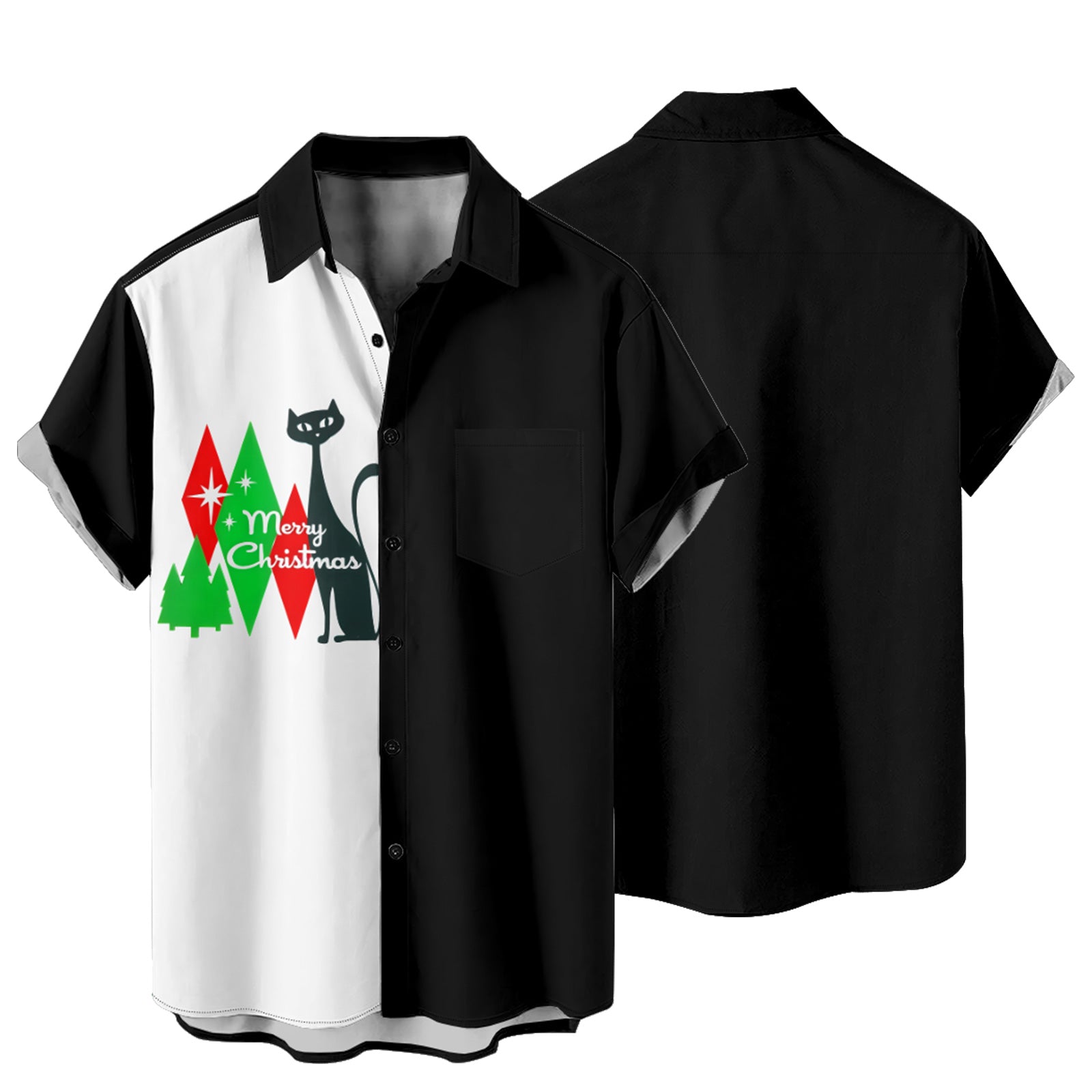 Christmas Cat and Tree Men's Shirt Long Sleeve Button Up Shirt