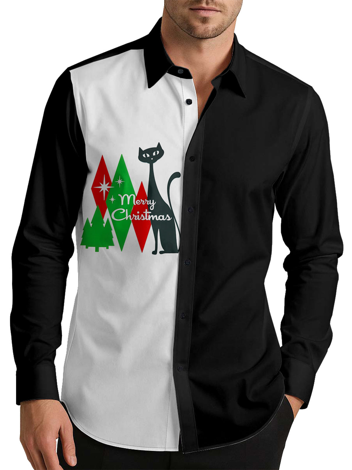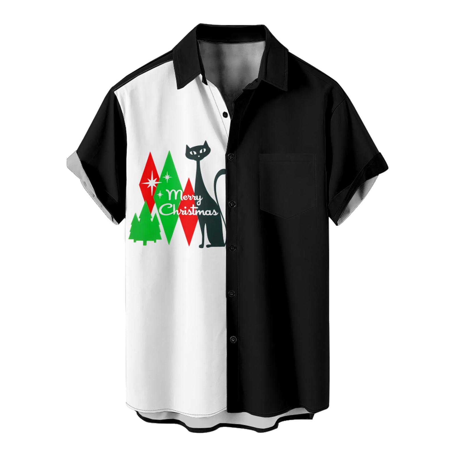 Mid-century Retro Art Christmas Black Cat Men's Pocket Shirt Stretch Quick Dry Button Up Shirt