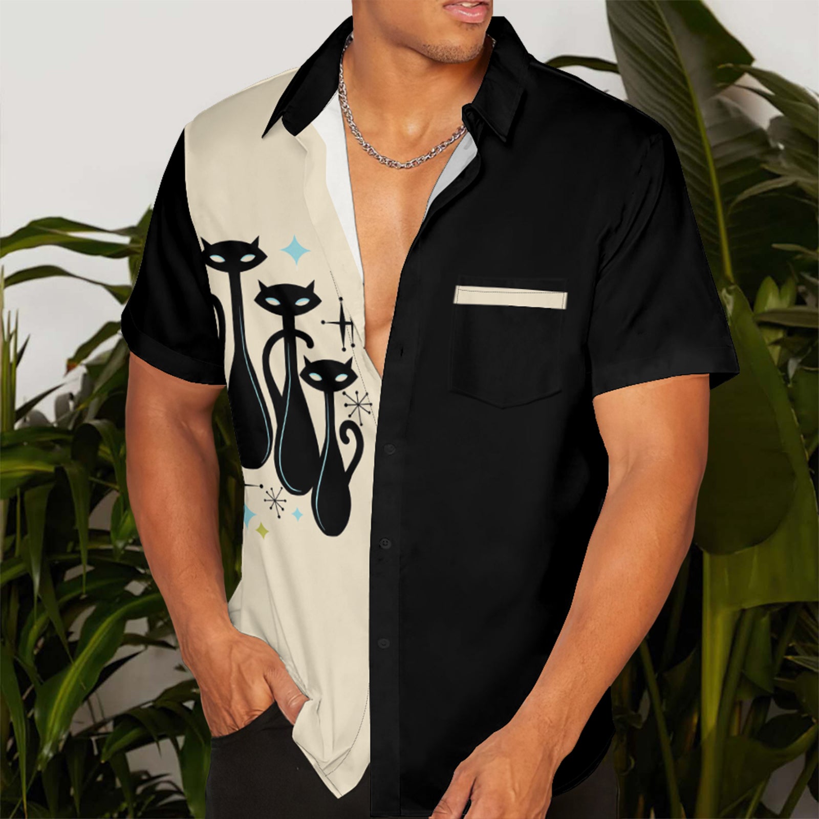 Vintage Cat 1950s Reto Art Men's Pocket Shirt Stretch Quick Dry Button Up Shirt