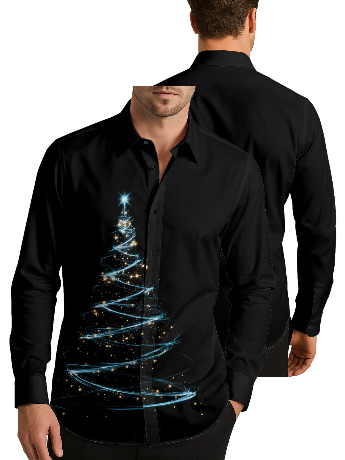 Glitter Blue Christmas Tree Men's Shirt Long Sleeve Button Up Shirt