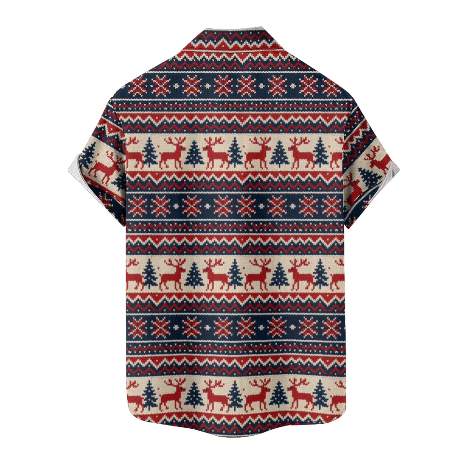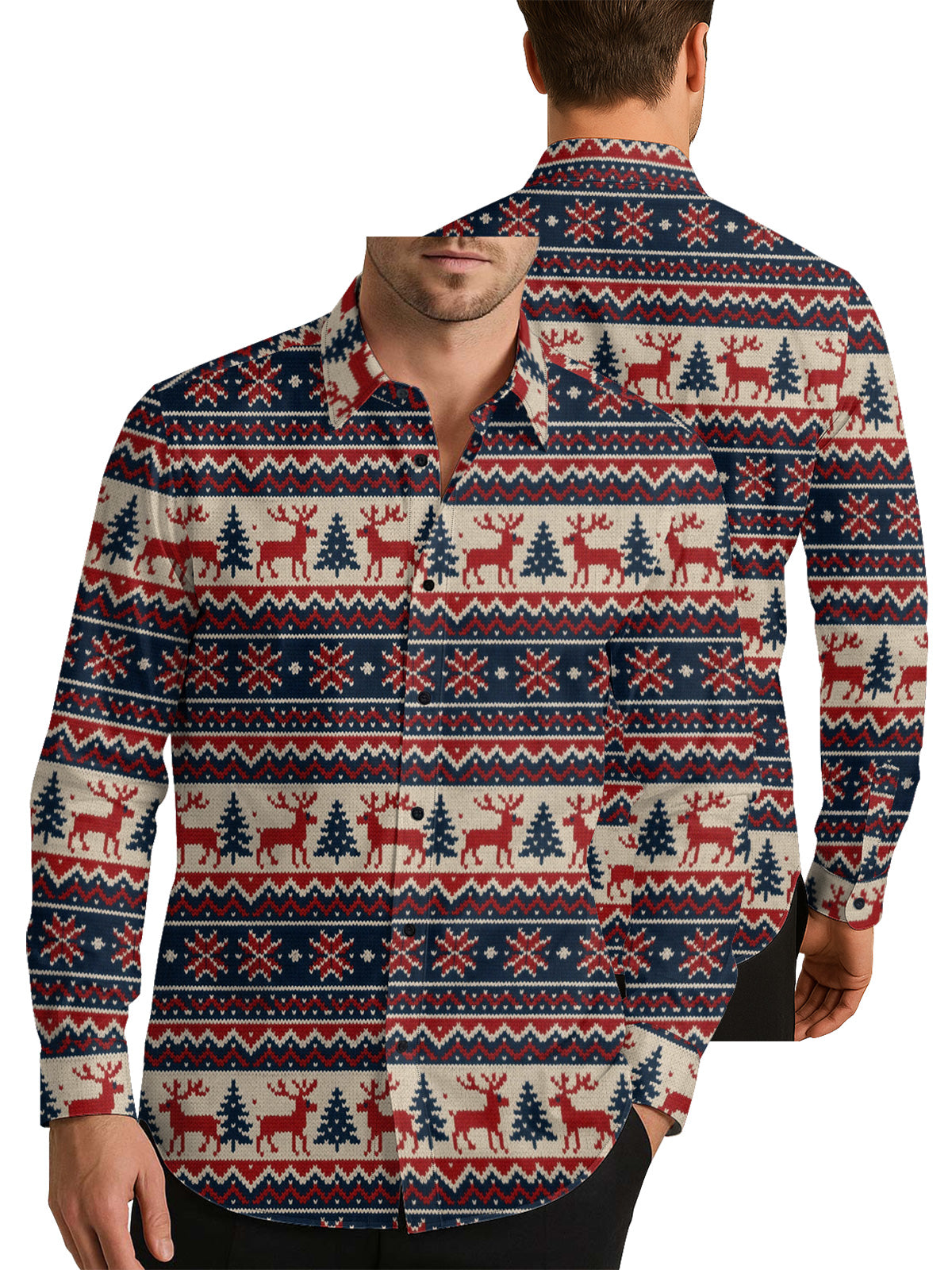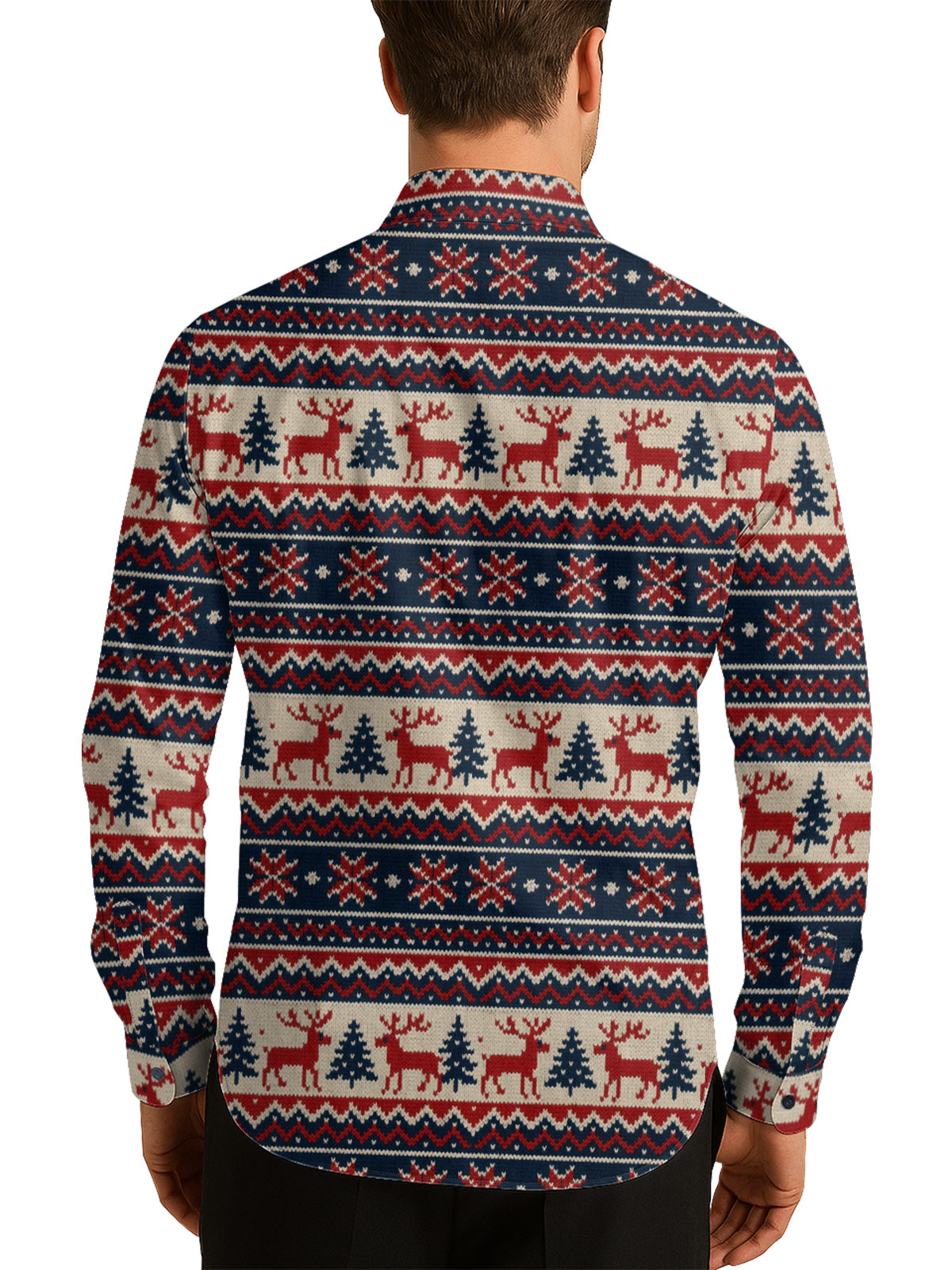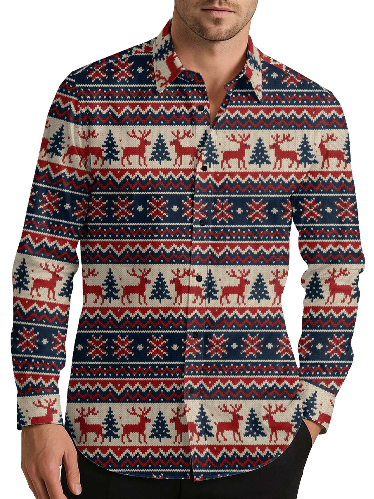 Hand-Knitted Printed Christmas Men's Shirt Long Sleeve Button Up Shirt