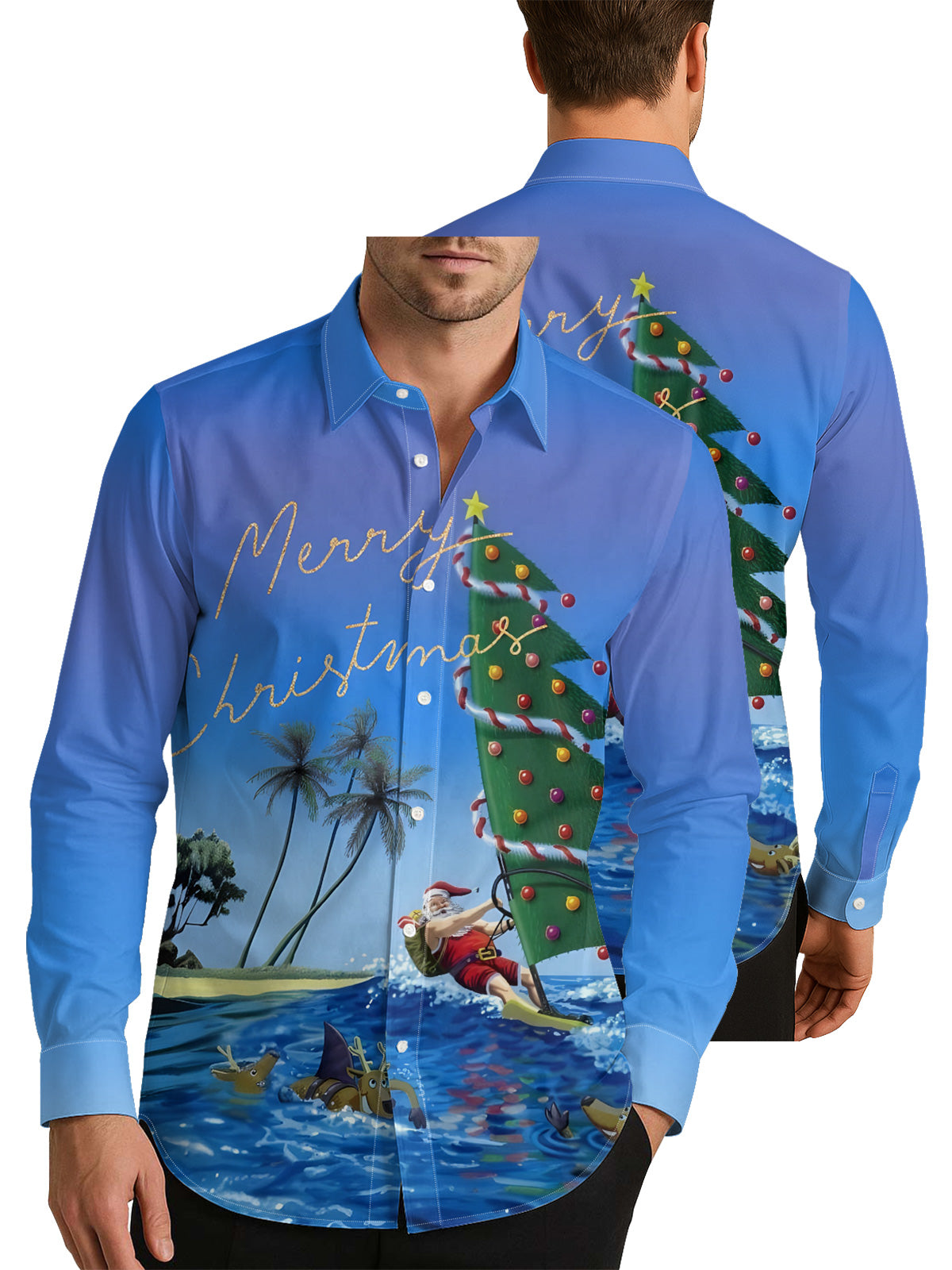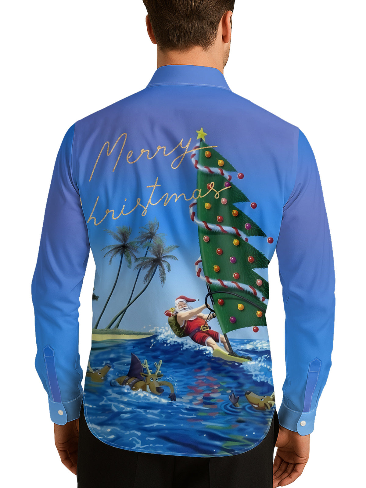 Santa Claus Surfing Christmas Men's Shirt Long Sleeve Button Up Shirt