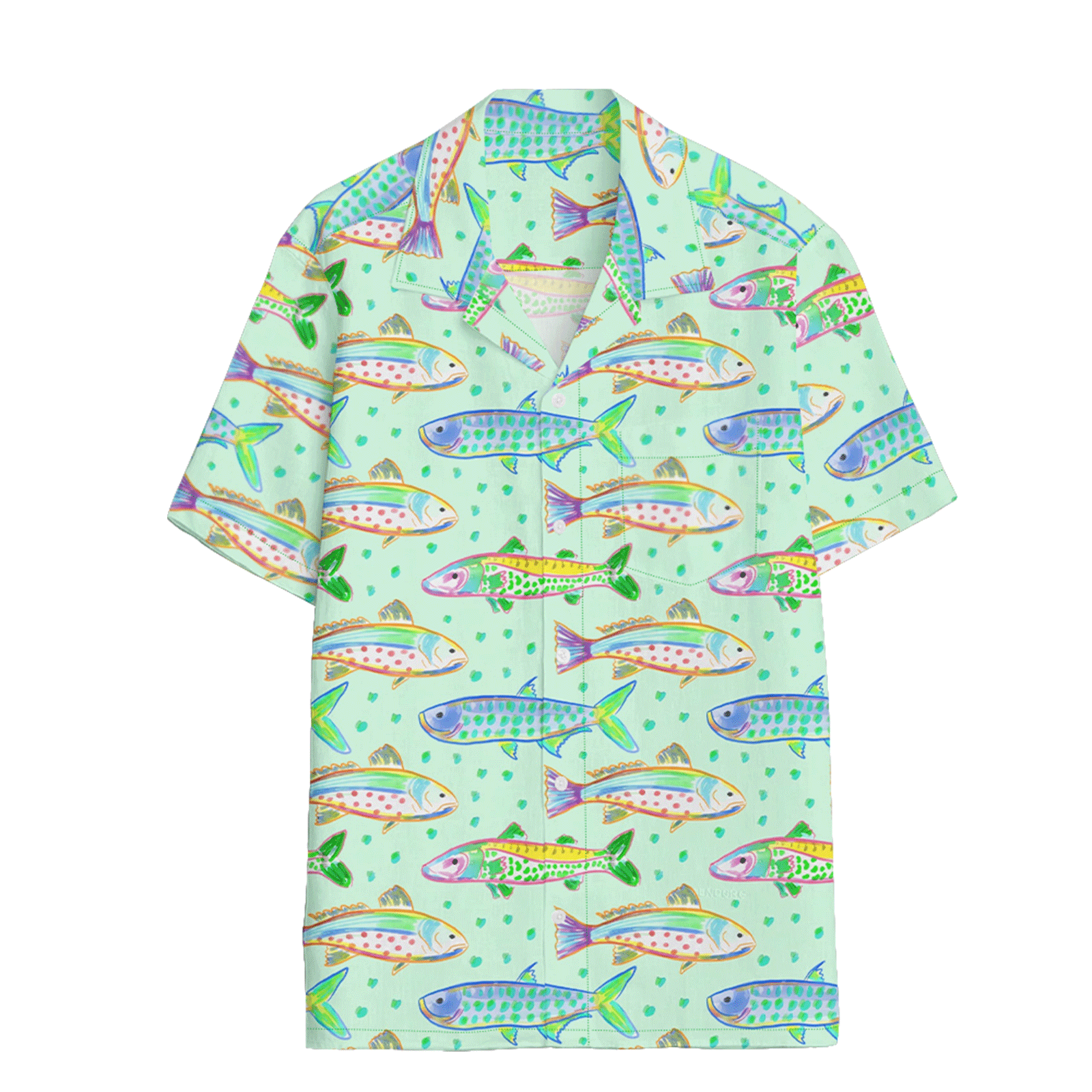 Watercolor Tropical Fish Men's Cotton Hawaiian Shirt Pocket Camp Shirt