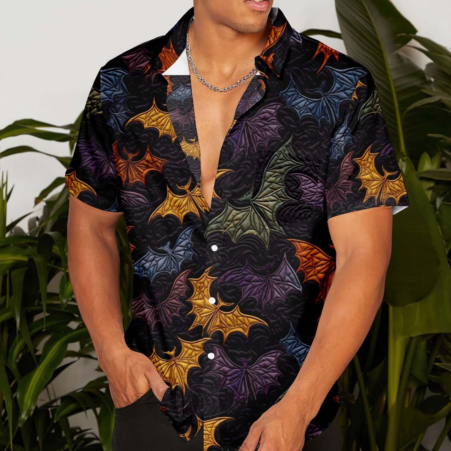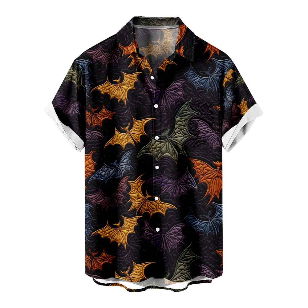 Halloween Bats 3D Embroidery Men's Pocket Shirt Stretch Quick Dry Button Up Shirt
