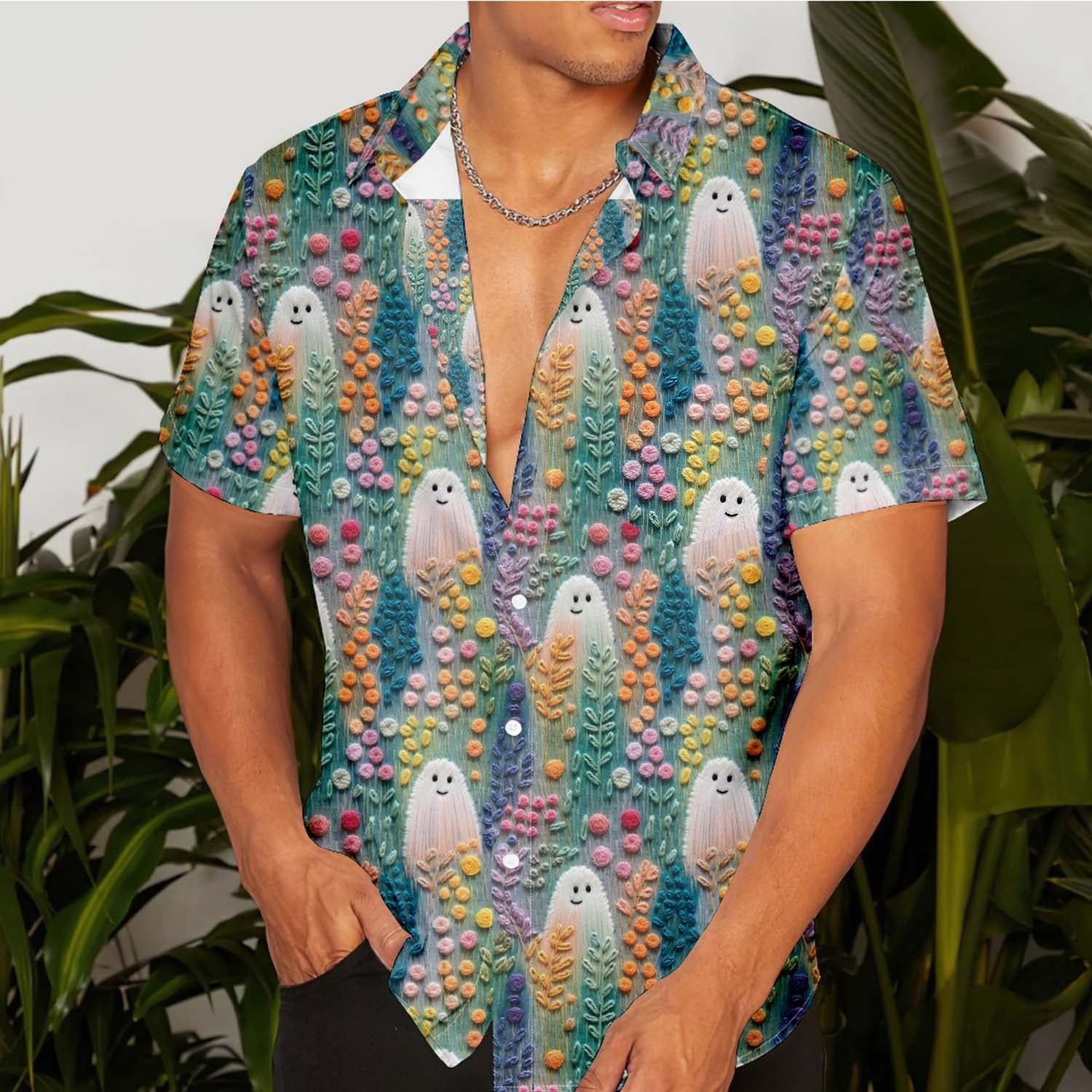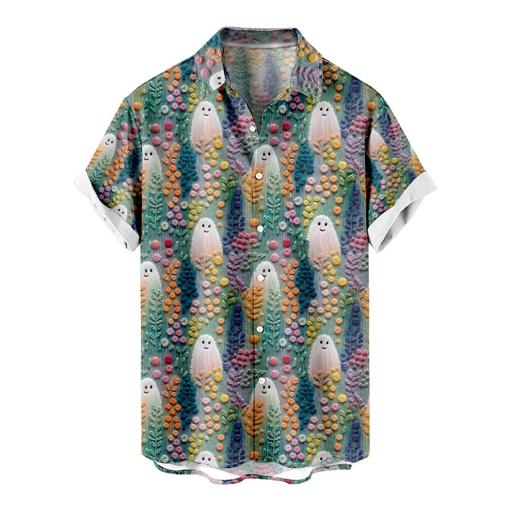 Halloween Cute Ghost 3D Embroidery Print Men's Pocket Shirt Stretch Quick Dry Button Up Shirt