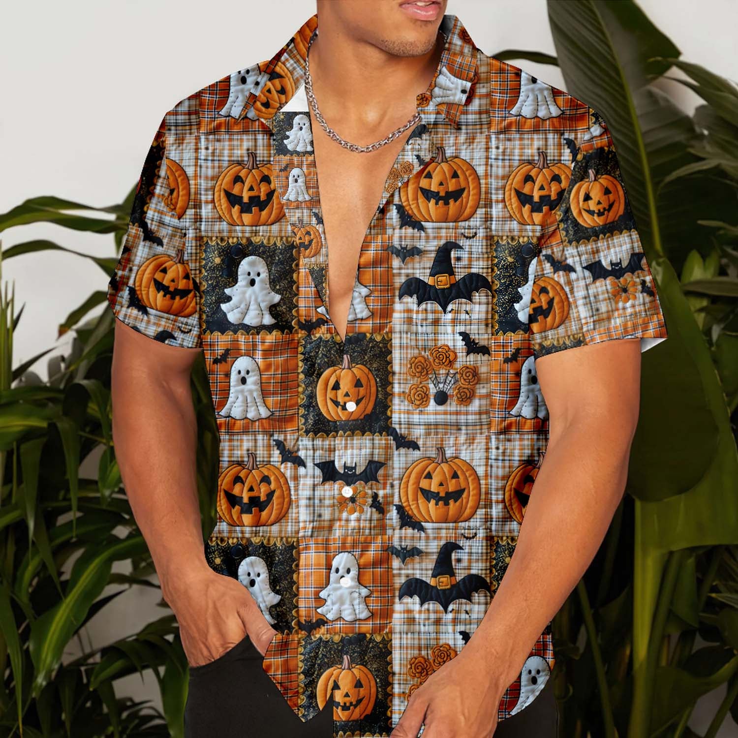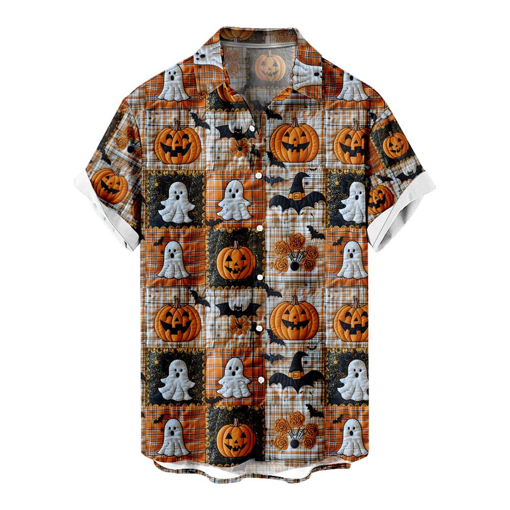 Halloween Patchwork Art 3D Embroidery Print Men's Pocket Shirt Stretch Quick Dry Button Up Shirt