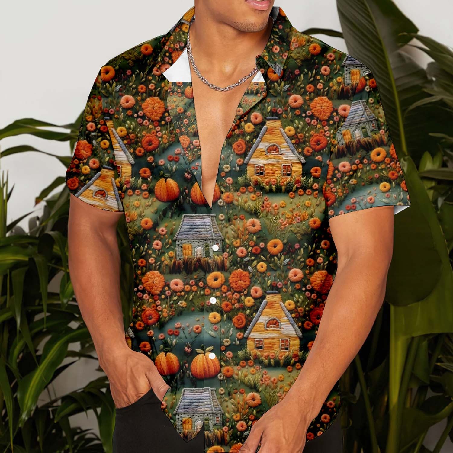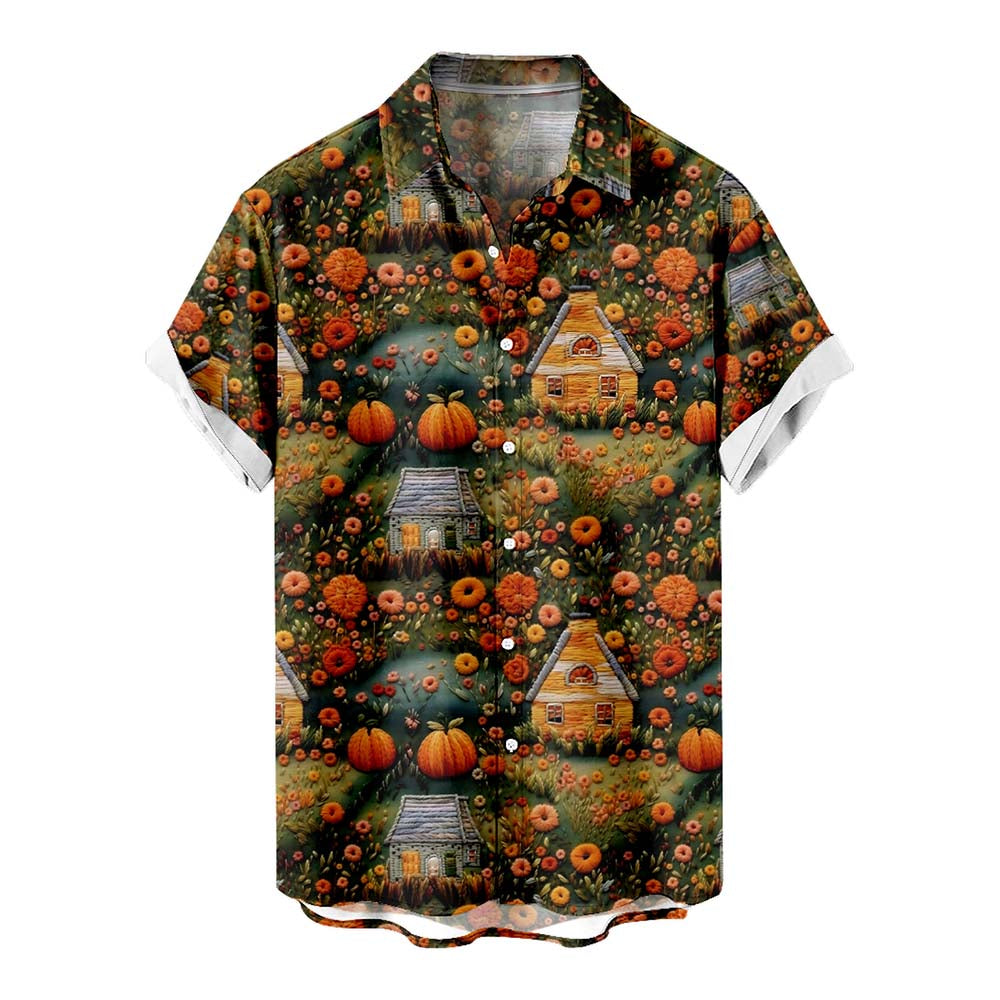 Halloween Pumpkin Garden 3D Embroidery Print Men's Pocket Shirt Stretch Quick Dry Button Up Shirt